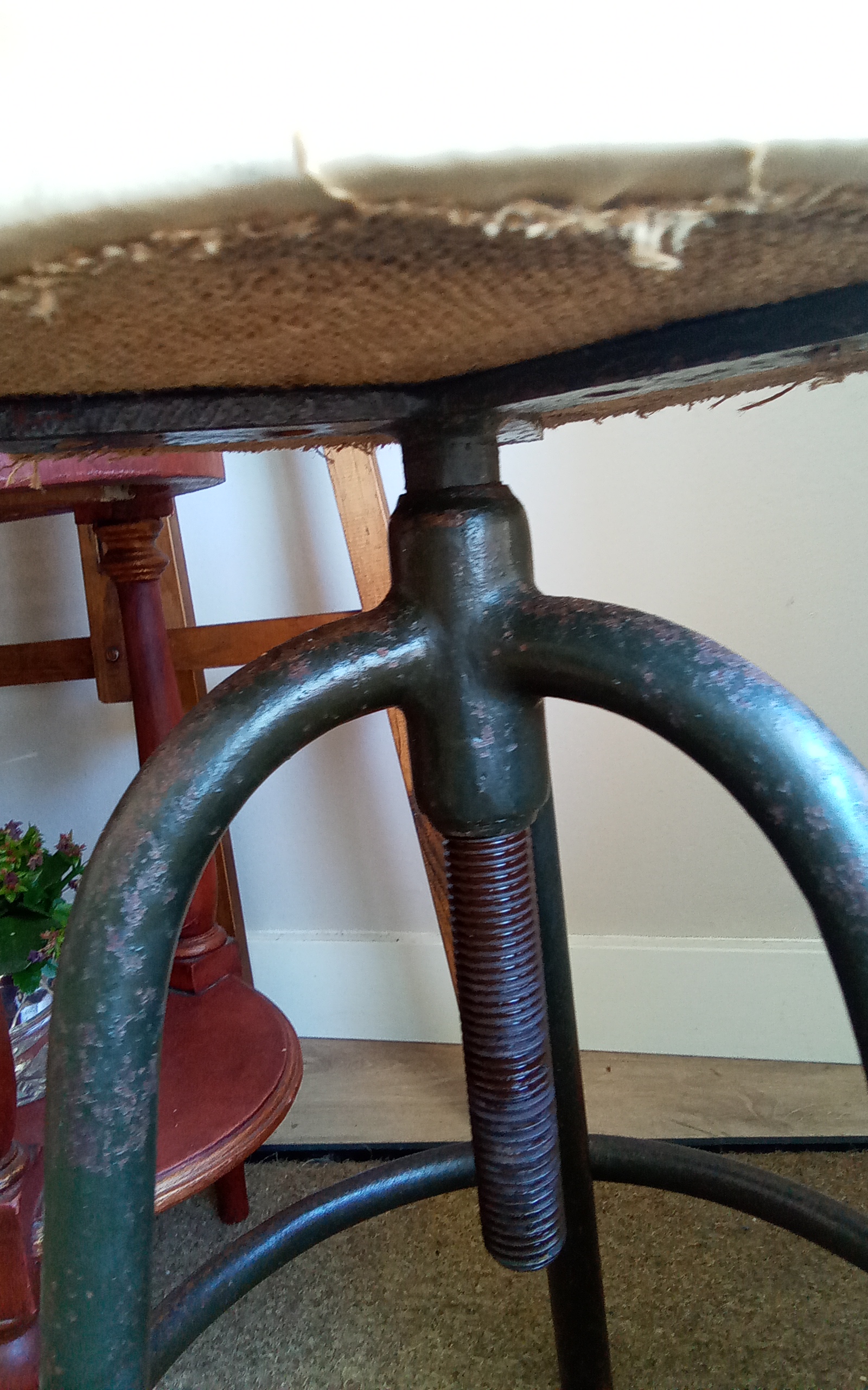 Antiguo taburete de hierro giratorio regulable en altura con el asiento en blanco..precioso.