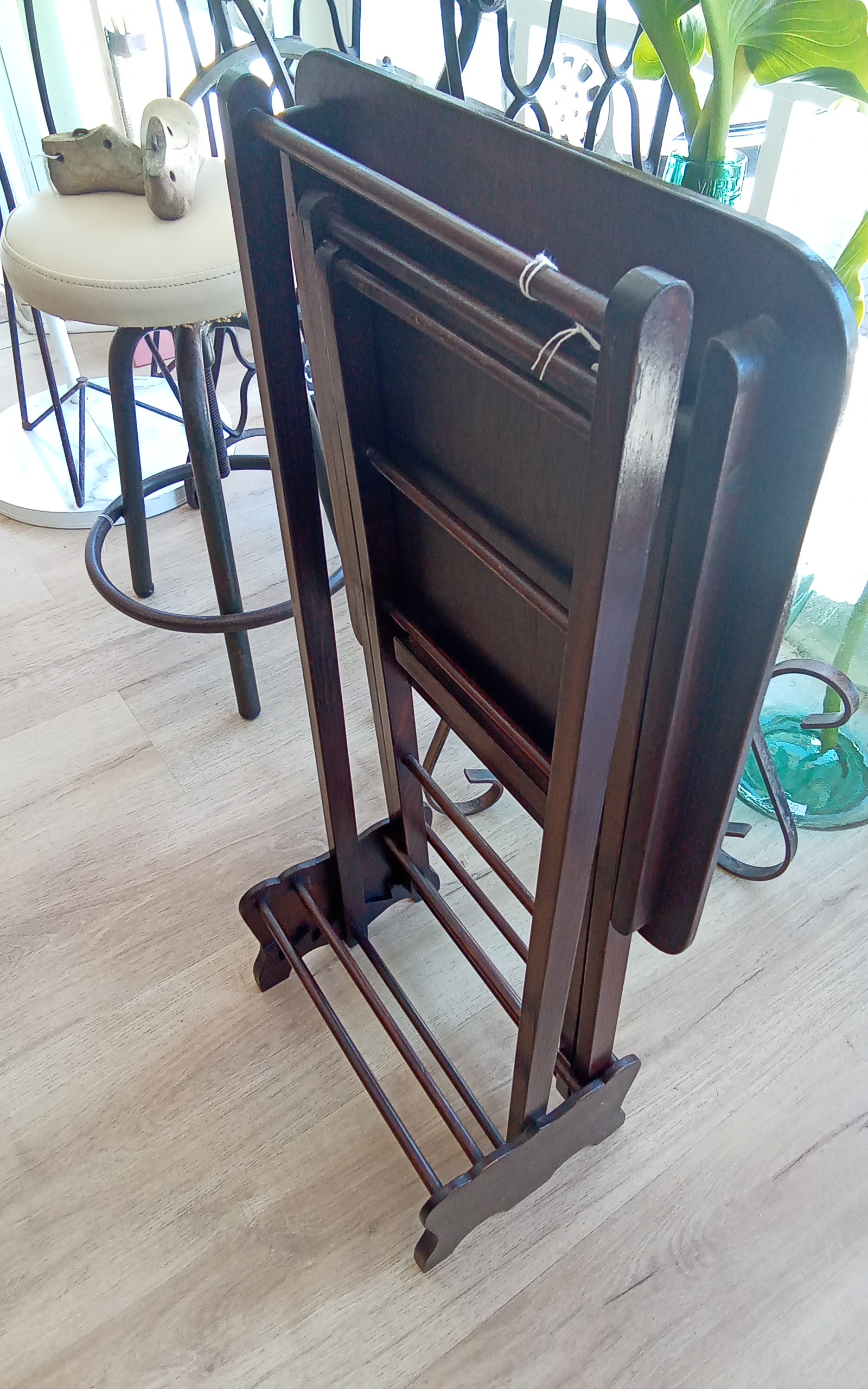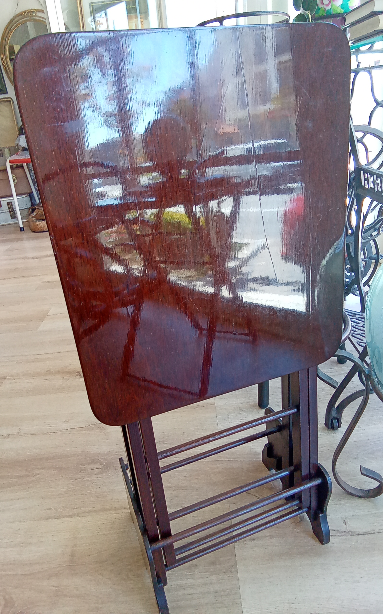 Antiguas mesitas auxiliares plegables con soporte en madera de caoba años 50..