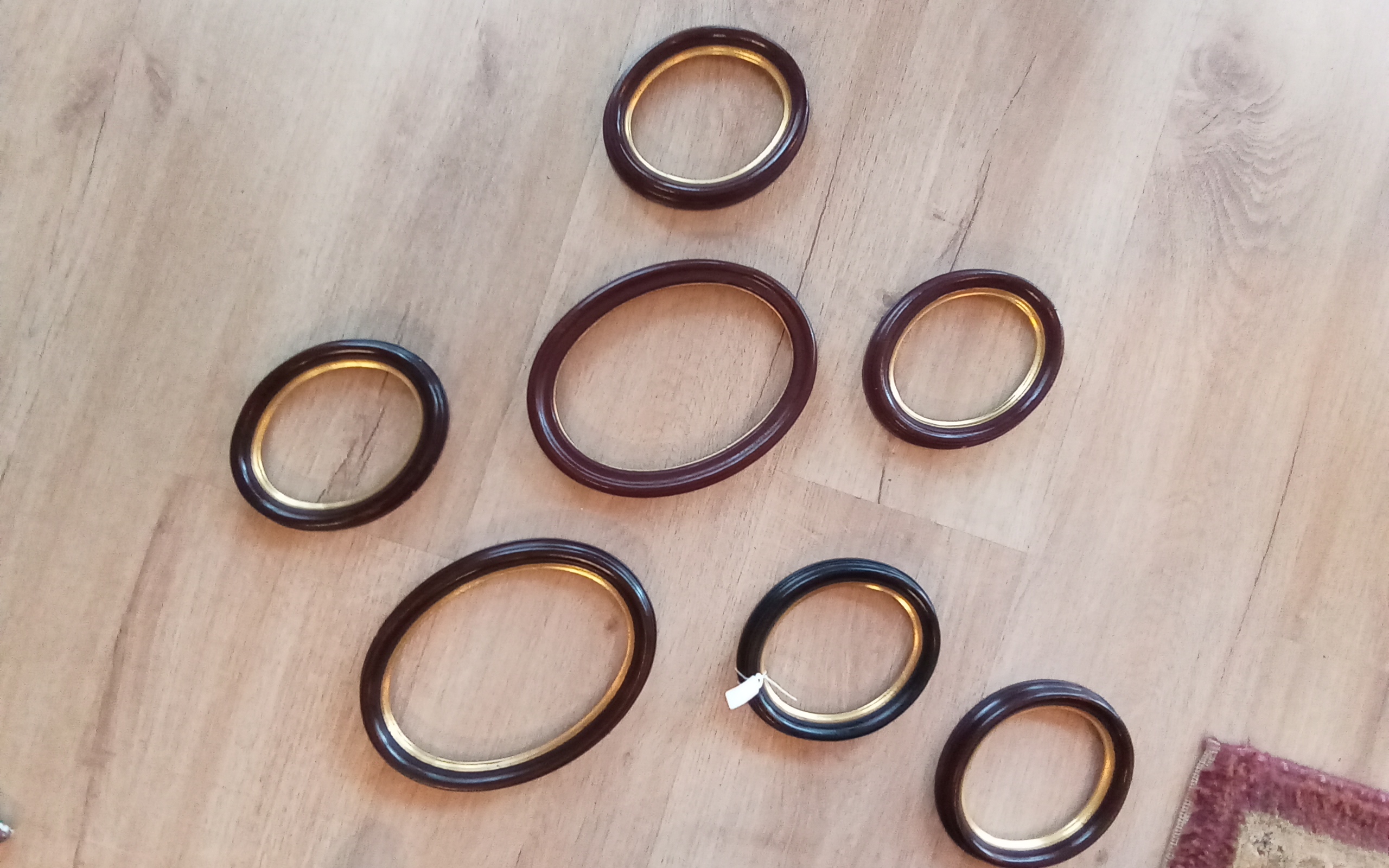 Antiguos marcos de madera con forma ovalado dos medidas distintas los G. miden 21 cm de largo y los P. miden 14 cm y cuestan 15€..precio unidad.