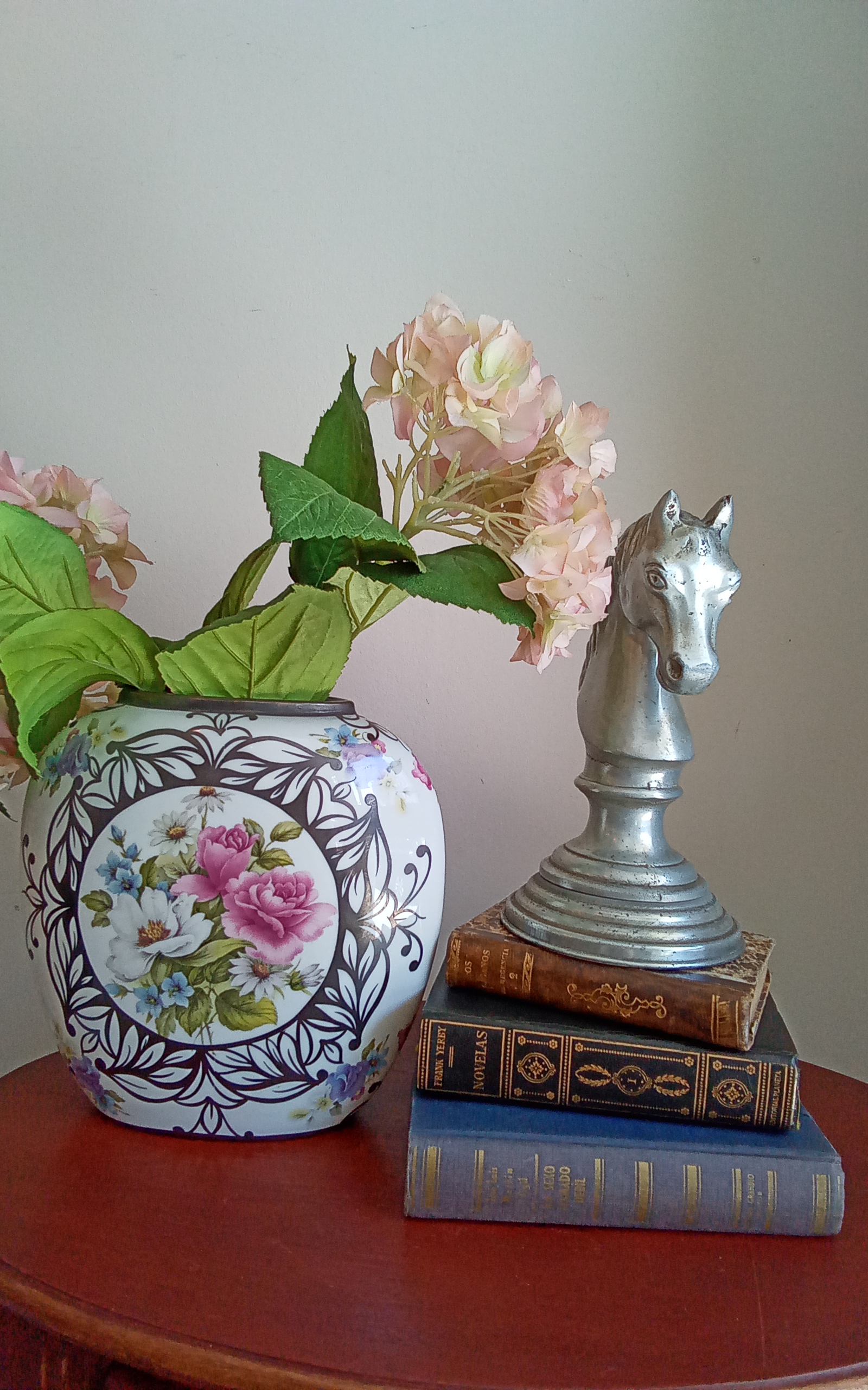 Antiguo jarrón en porcelana de bohemia con replique montre pas cher filo en plata con dos caras distintas de flor..